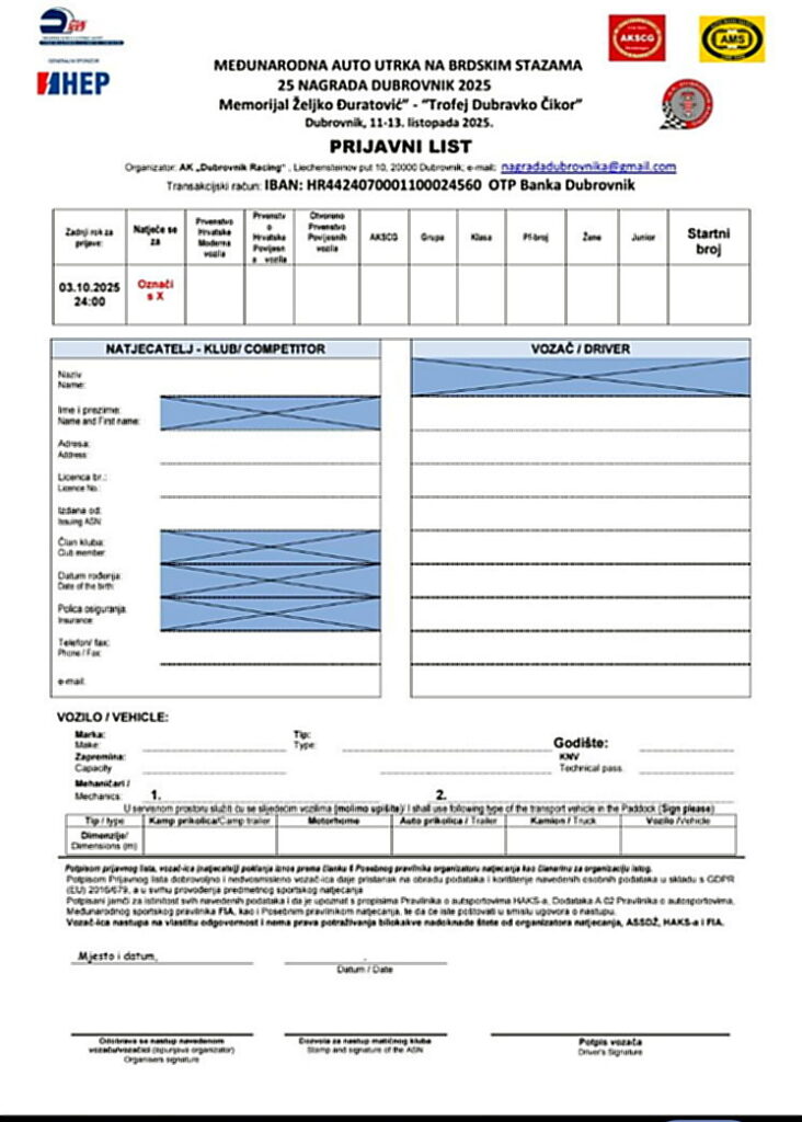 5.1.2.- Svi takmičari i vozači iz inostranstva moraju za nastup na trci posjedovati pisano odobrenje izdano od nacionalnog saveza (ASN) temeljem odgovarajuće licence.